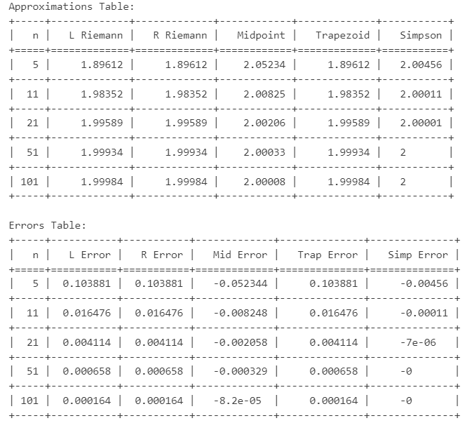 approximations.append([ n, round(I_riemannL, k), round(I_riemannR, k), round(I_mid, k), round(I_trap, k), round(I_simp, k) ]) errors.append([ n, round(err_riemannL, k), round(err_riemannR, k), round(err_mid, k), round(err_trap, k), round(err_simp, k) ])